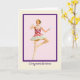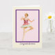 This card offering congratulations for a dance recital performance features a young ballerina in a pink and white costume. She is wearing white gloves and a white ribbon is in her hair. The background of the image is a light pink.