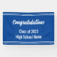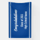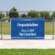 This deep blue and white graduation banner has a text template you can edit to congratulate your school's graduating class. As shown, the top line is a white script that reads 'Congratulations'. The second line can be changed to the class year if necessary. The final line is for the school name. All text can be edited or deleted.