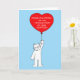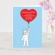 A large white fluffy cat holding a large red balloon with the words 'Congratulations on finalising your adoption' on it.