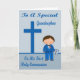 Congratulate your grandnephew on his First Holy Communion with an adorable boy dressed in a blue suit with a bow tie and cute, pink flower on his lapel holding a Holy Bible. Background is blue with a dark blue cross and text.
