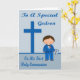 Congratulate your godson on his First Holy Communion with an adorable boy dressed in a blue suit with a bow tie and cute, pink flower on his lapel holding a Holy Bible. Background is blue with a dark blue cross and text.