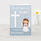 Congratulate your daughter on her First Holy Communion with an adorable girl dressed in a white gown with a flower veil, pink buttons and a pink belt. Background is blue with a white cross with light blue shading and white text.