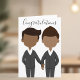 A beautiful wedding congratulations card for a gay couple getting married. Features a drawing of a black man and a Hispanic or African American man wearing tuxedos and holding hands. A cute LGBT greeting card to congratulate two men.