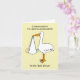 A simple illustration of a white stork holding a baby in a white sheet, which hangs from it's beak. The image is set against a lemon coloured background and is accompanied by the words 'Congratulations to a special goddaughter on her baby shower'.