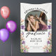 This graduation party banner is accented with peach and purple wildflowers and lush greenery. The elegant layout includes space for a photo and is adorned with simple handwritten script. Personalize with name of the graduate and their school and graduating year.