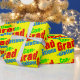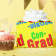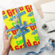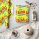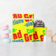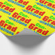 A colourful wrapping paper with Con-Grad-ulations written in green, red, and blue.