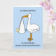 A cartoon stork with a baby boy, set against a pale blue colored background. The words 'Congratulations on becoming a great great grandmother' accompany the image.