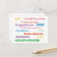 A design that says Congratulations in many languages and colours! Some examples include congratulations in Spanish, French, Russian, Japanese and more in colours like pink, purple, and yellow