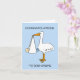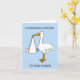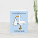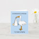 A cartoon of a baby being held in a sheet which hangs from a stork's beak. The image is set against a blue background and accompanied by the words 'Congratulations to both Moms'.