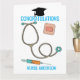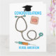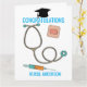 A personalised male nurse graduate card featuring a graduate cap, blue stethoscope, band-aid and a needle. You will be able to easily personalise the front of this nurse graduate card with the nurse's name in blue text. The inside reads a congratulations graduate message hat can be personalised by you and the back features a grad cap along with the class year, which you can also personalise. This big nursing school graduate card is a great keepsake for the nurse grad.