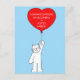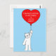 A cute white cat standing up holding a large red balloon, against a pale blue background The balloon has 'Congratulations on becoming a foster parent ' written on it.