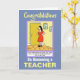 Greetings Card for a newly qualified Teacher. Congratulations to a graduate who has trained to be a teacher. Outside a bedroom, a mother says, "You've got to go to school, and that's final". Personalise with your message. Congratulations card for a new teacher.
