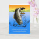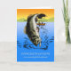 Congratulations on retirement for a husband. Greeting card with vintage fishing scene of two fishermen in a boat catching a large mouth bass. The fish is splashing in the lake water and making waves. Retro scene with soft muted colour scheme. Sunset over green hills fills in the upper area. Art, image, and verse copyright © Shoaff Ballanger Studios.