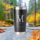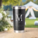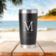 This elegant minimalist simple fun Retirement Congratulations Thermal Tumbler has a simple black background, grey monogram, and white script text. Easy to personalise, just change or delete example name, monogram, and text. Great gift for a retiree. All Rights Reserved © 2025 Alan & Marcia Socolik.