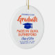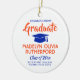Commemorate the graduate's achievement with a custom photo orange, blue and white round graduation Christmas ornament. Picture and all text are simple to customise. Include school name and degree, congratulations, thanks mum and dad, or other message of your choice. Design features a white background, blue graduation cap, personalised modern typography name, school, & class year, and one photo of your choice, such as a senior picture or image from the commencement ceremony. Makes a thoughtful keepsake gift idea and an elegant addition to Xmas home decor. Congratulations to the graduate!