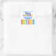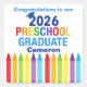 This adorable 2026 preschool graduation party sticker features a cool grad cap above colorful writing and a row of crayons in rainbow. Cute customizable pre-K graduate decor in fun colors for the last day of elementary school with your kid's name personalized in blue. Congratulations to our preschooler.