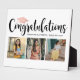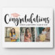 Stylish 3 photo graduation plaque display sign with easel features "Congratulations" in trendy black calligraphy script with rose gold / blush pink coloured grad cap and modern custom text for the graduate's name and class year. Add three favourite photos of the graduate to the square placeholder images. Clean white background colour.