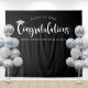 Extra large graduation ceremony or party backdrop for all of the graduates' photos! Design is minimalistic and features a modern white "Congratulations" calligraphy script design with silver gray grad cap accent on a black background. Personalize the custom text with the class year and school name.