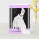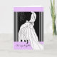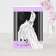Congratulations greeting card for a daughter to congratulate her on a wedding. Bride in long white gown with flowing train and bow. Elegant card with light lavender, white, and black colour scheme. Elegant flourish element in upper left corner of card. Art, image, and verse copyright © Shoaff Ballanger Studios.