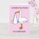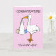 A giant cartoon stork holds a baby boy in a white sheet which hangs from the stork's beak. The image has pastel pink background.