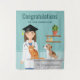 Congratulate a veterinary student on their graduation with the help of this personalizable design featuring Destei's original cute cartoon illustration of a veterinarian woman in an examination room of a veterinary clinic. The veterinarian is wearing a black graduation cap with a yellow tassel, a white laboratory coat, blue scrubs and she has a stethoscope around her neck. The veterinarian has brown hair and a smiling face expression.