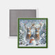 Two large buck deer, antler to antler, overlook a carrot-nosed snowman nestled in pine cones. The snowman, sporting a black hat and orange scarf, is surrounded by white turtle doves. A snowy conifer pine forest provides the backdrop, while colourful transparent bubbles float in the grey, snowy sky.