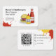 A simple design features a QR code social media photo, modern simple minimalist contemporary, food burger hamburger hotdog frank, contact info phone email website, a Facebook Instagram Pinterest Twitter, a trendy stylish website connect pro, a basic clean digital scannable scan, elegantly minimalist design style, food truck restaurant diner stand, food vendor truck, cart or stand small business
