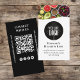 This design features a connect with us with QR code business card template with the add your own logo photo, for professional business corporate template, with social media Facebook Instagram icons, and a simple minimalist contemporary style, with online website web address URL, a modern simple typography design, a trendy stylish basic clean, great for small business owner shop store, a basic black and white template