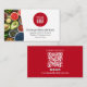 This design features a connect with us with QR code business card template with the add your own logo photo, for professional business corporate template, with social media Facebook Instagram icons, and a simple minimalist contemporary style, with online website web address URL, a modern simple typography design, a trendy stylish basic clean, great for small business owner shop store, a basic red and white template