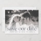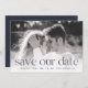 Announce your wedding date in unforgettable style with these elegant and modern photo save the date cards, featuring a full bleed horizontal or landscape orientated photo with "save the date" overlaid in navy blue lettering along the bottom. Your names, wedding date, and wedding location appear beneath in modern lettering. Personalise the back with additional details, such as your wedding website.