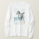 A white ladies longsleeved t-shirt with a Connemara Pony galloping through the waves at the edge of the shore, from a watercolour painting by Judy Adamson.