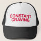 CONSTANT CRAVING fun and ironic slogan on trucker hat, red, funny typographic statement, inspired by tv comedy character frank rossitano. constant and perpetual cravings.