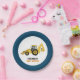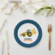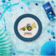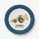 Plate features a construction theme with a navy blue border and a yellow backhoe in the middle. Customise the text with your own details, or delete to use without text. Great for a construction theme baby shower or birthday party!