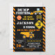 Yellow and orange Construction theme invitation for boy birthday party featuring bulldozer, big dump truck and some construction equipment.