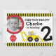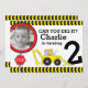 Construction kids 2nd Birthday party invitation featuring a digger scooping and bright yellow and black warning stripes. Perfect to invite your son's favourite friends to his construction / building birthday party. Customise with your own birthday details and photo. Uniquely designed and illustrated by Sarah Trett.