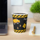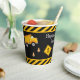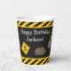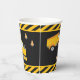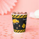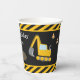 Celebrate your little one's special day with this custom boy birthday party paper cup with an adorable construction theme. The paper cup has a dump truck and excavator working together at a road construction site. There are also orange traffic cones, a yield sign, and yellow and black stripes. Add your child's age for a special touch!