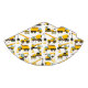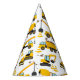 Construction birthday party hats featuring a simple white background, with cute cartoon illustrations of bunting, stop signs, a dump truck, a digger, a wrecking ball crane, and splatters of dirt.