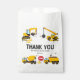Kids construction birthday party thank you favour bags featuring a simple white background, with cute cartoon illustrations of bunting, stop signs, a dump truck, a digger, a cement truck, a wrecking ball crane, splatters of dirt, and a thank you template that is easy to personalise.