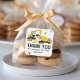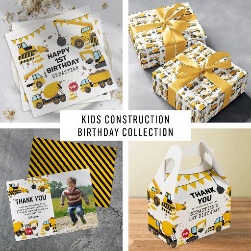 Kids construction birthday thank you stickers featuring a simple white background, with cute cartoon illustrations of a digger, a cement truck, traffic cones, splatters of dirt, and a thank you template that is easy to personalise.