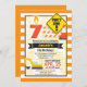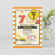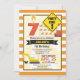 Construction theme boy's birthday party invitation on orange and white striped pattern background. Personalise this cute, invite with your child's name. Features yellow excavator, construction party zone sign, orange cone, and a 7th, seventh birthday candle than can be personalised. Perfect for baby's first, 1st, birthday, toddler, young children, or older kids. Colours include orange, yellow, grey, black and white.
