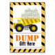 Add fun to your construction-themed birthday party with our "Dump Gift Here" gift station sign featuring a dump truck. Customise with your word if you prefer the words in the sign to mean otherwise. Watch the excitement as guests drop their gifts.