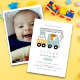 Cute little dino's at work in construction truck, Impress your guest by this cute and amazing birthday invite , Customise with your little one's picture to make this invitation extra special