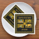 This design features four classic construction trucks in bold yellow arranged together on a brown and black background. It includes other construction items like guard rails and traffic cones and black and yellow traffic stripes. We have you covered for a construction trucks themed party: supplies, decor, delicious treats and meaningful personalised gifts!