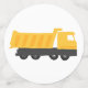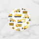 Cute construction vehicles with caution signs and construction cones on a white background birthday party pattern.