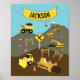 Cute illustration of a construction site and trucks theme. Construction truck transportation vehicles include dump truck, excavator, backhoe, bulldozer, crane and front end loader. The perfect design for truck, heavy machinery enthusiasts boys and girls. Ideal Christmas present, birthday gift, nursery decor, kids room art, home decor or back to school. Customise the name and make it your own.