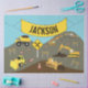 Cute illustration of a construction site and trucks theme. Construction truck transportation vehicles include dump truck, excavator, backhoe, bulldozer, crane and front end loader. The perfect design for truck, heavy machinery enthusiasts boys and girls. Ideal Christmas present, birthday gift, nursery decor, kids room art, home decor or back to school. Customise the name and make it your own.