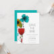 This customisable wedding save the date card has a clean and modern look. It features a floral illustration inspired by Art Nouveau design in black, bright turquoise blue, red, light green and golden yellow. Your custom text is in a clean sans serif font.