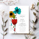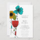 This customisable wedding invitation has a clean and modern look. It features a floral illustration inspired by Art Nouveau design in black, bright turquoise blue, red, light green and golden yellow. Your custom text is in a clean sans serif font.