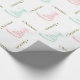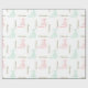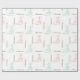 A modern Christmas wrapping paper featuring a pattern of green and red Christmas trees made of swirling stars, interspersed with the word 'Christmas' in gold, on a white background.