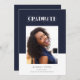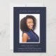 Contemporary geometric typography and colour block, graduation announcement and invitation card. Modern geometric "Graduate" on navy blue backgrounds. Template lines for graduate's name, graduation year, school name and graduation party details on back. Single framed photo on front and an additional photo space on back.
